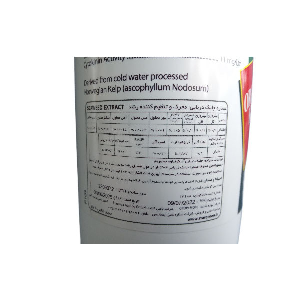 این کود مایع از عصاره جلبک دریایی از آبهای سرد اقیانوس و از نوعی جلبک استخراج شده است.این کود سرشار از هورمون ها و تنظیم کننده رشد به همراه عناصر غذایی فراوان و پر مصرف همراه باریز مغذی های کلاته می باشد.مصرف این کود روی گیاهانی که در حال جوانه زنی هستند باعث افزایش رشدجوانه زنی می شود.در صورتیکه 15 روز قبل از برداشت محصول استفاده شود عمر مفید میوه و سبزیجات را افزایش می دهد.استفاده از کود جلبک دریایی برای گیاهان علوفه ای , میزان جذب عناصر غذایی گیاه , درصد پروتئینگیاه و هم چنین رشد گیاه را افزایش می دهد.عصاره جلبک دریایی هم چنین باعث افزایش عملکرد محصول , مقاومت گیاه دربرابر سرما زدگیو بیماری و مقاومت در مقابل تنش و استرس گیاه در شرایط خاص می شود. میزان ونحوه مصرف : مصرف به صورت محلولپاشی یا همراه سیستم تحت فشار آبیاری بهترین نتیجه را دارد.این کود به مقدار 2 لیتر در هکتار و هر 15 روز یک بار روی گیاهان زراعیو درختان میوه توصیه می گردد. در صورت استفاده ار آبیاری تحت فشار 2 تا 3 لیتر در هکتار توصیه می شود. مهم ترین هورمون های کود جلبک دریایی : اکسین : انواع مختلفی از اکسین ها وجود دارند که هرکدام نقش خاصی برای گیاه دارند,که یکی از ویژگی های آن ایجاد توازن در مراحل رشدی است.اکسین ها هم اثر تحریک کنندگی رشد و هم تاخیر در رشد را دارا می باشند.سیتوکین ها : این هورمون ها نقش مهمی در رشد جوانه ها و جلوگیری از سرما زدگی در گیاهان را دارند. هم چنین آن ها از یخ زدگی حاشیه ای تا (3 درجه سلسیوس )از گیاه محافظت می کنند. بتائین ها : این گروه نقش مهمی در پدیده دارند.با کمک در افزایش جذب آب در گیاه بهویژه در شرایط خشکی برای گیاه بسیار مناسب است.