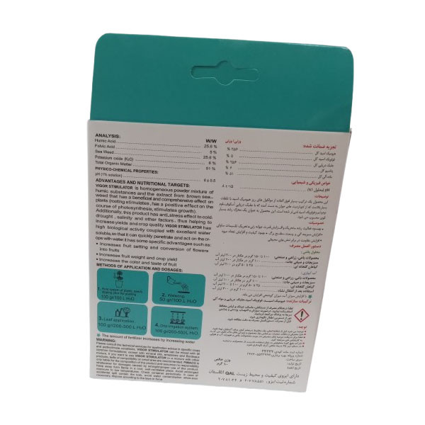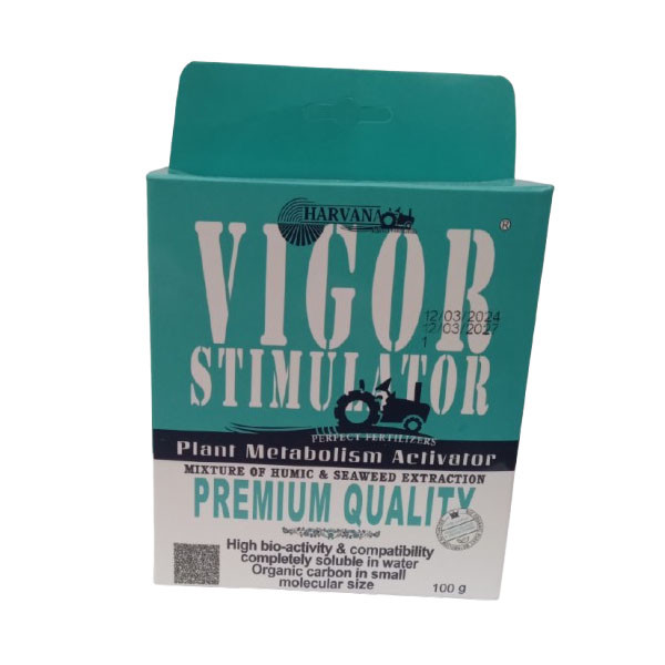 VIGOR STIMULATOR مخلوط پودری همگن از هیومیک اسید و جلبک دریایی آسکوفیلوم نودوسوم، یک محصول کاربردی و محرک رشد قوی است که برای محصولات زراعی، باغی و گل های زینتی در طول دوره رشد از زمان تشکیل ریشه و برگ تا گلدهی و میوه طراحی شده است. این محصول اثرات چشمگیر و سودمندی بر روی گیاهان دارد از جمله: افزایش چشمگیر در گلدهی، افزایش تعداد میوه، محرک ریشه، دارای اثرات مثبت بر روی فتوسنتز. همچنین این محصول اثرات ضد استرسی نسبت به عوامل محیطی از جمله خشکی، سرما، شوری و .... دارد، از این رو به افزایش راندمان و کیفیت محصول کمک می کند.