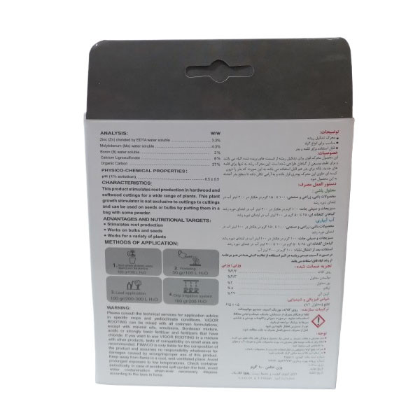 VIGOR ROOTING یک محرک رشد ریشه است که برای طیف وسیعی از گیاهان قابل استفاده است. این محصول برای استقرار و بهبود رشد سیستم ریشه ای گیاهان بسیار مناسب می باشد. استفاده از این محصول قبل از انتقال نشاء به زمین و نیز در اوایل استقرار گیاه در خاک، کمک می کند تا با سرعت چشمگیری ریشه های موئین شروع به رشد کرده و در بستر خود گسترش یابد. همچنین این محصول قابلیت استفاده به شکل بذر مال را دارد.