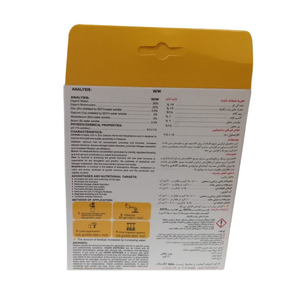 VIGOR EXPROMA جهت افزایش کیفیت و راندمان میوه، به ویژه پسته، طراحی شده است. این محصول غنی از روی، بور، کلسیم و مولیبدن می باشد.